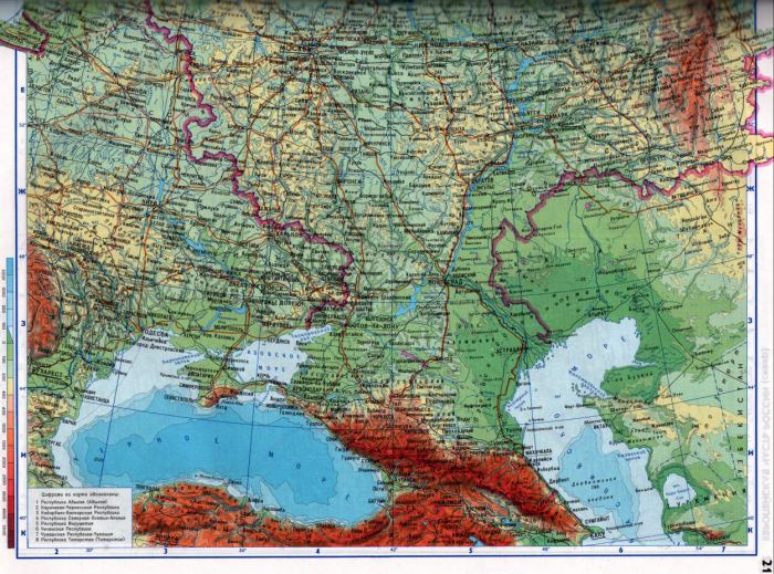 Карта России. Физическая карта Европейской части России от Баренцева до Черного моря, масштаб в 1см 100км
