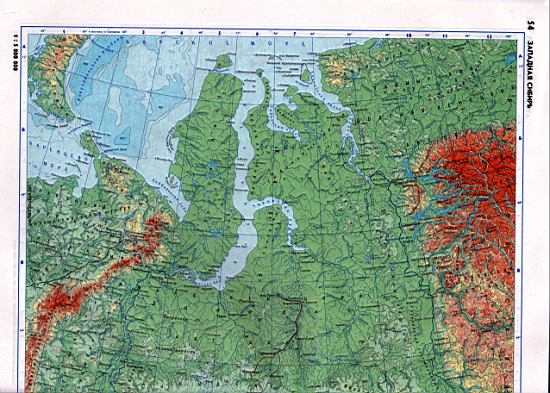 Карта России. Физическая карта Западной Сибири масштаба 1см 50км