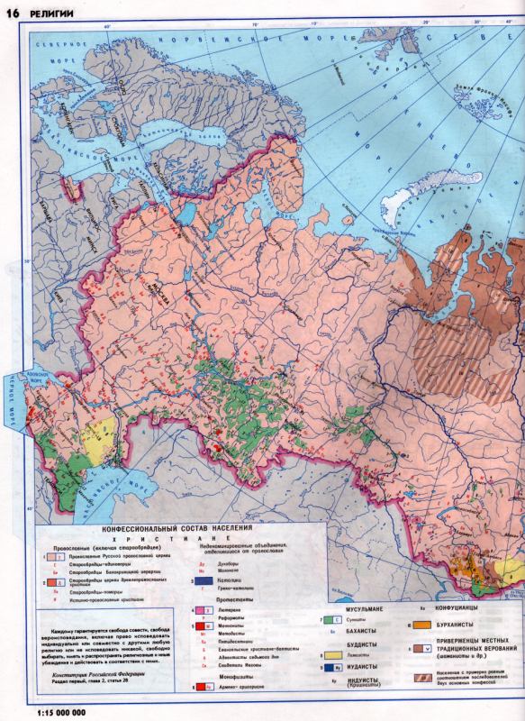 Карта России. Распределение населения РФ по религиозным конфессиям | |||